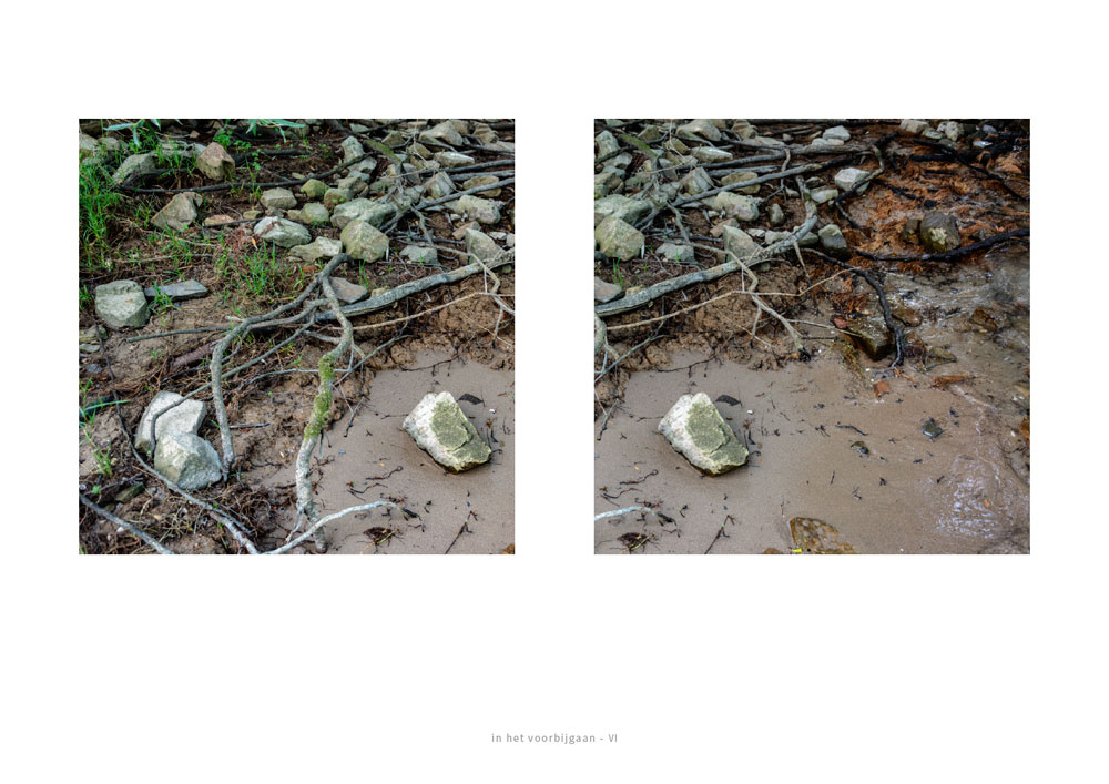Eén opvallend grillig gevormde plek met wonderlijke afbrokkelende contouren heb ik aandachtig bekeken. In het zand zijn talloze afdrukken en sporen te zien van mensen en dieren. In een omtrekkende beweging heb ik de plek vanuit de vier windrichtingen gefotografeerd, geïntrigeerd door het verschijnsel dat door mijn verplaatsing in ruimte en tijd dezelfde plek zich heel anders toonde, afhankelijk van de kijkrichting.